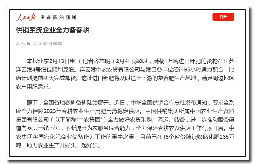眼下,全國(guó)各地春耕備耕陸續(xù)展開。近日,中華全國(guó)供銷合作總社發(fā)布通知,要求全系統(tǒng)全力保障2023年春耕農(nóng)業(yè)生產(chǎn)用肥用藥穩(wěn)定供應(yīng)。中國(guó)供銷集團(tuán)所屬中國(guó)農(nóng)業(yè)生產(chǎn)資料集團(tuán)有限公司(以下簡(jiǎn)稱“中農(nóng)集團(tuán)”)全力做好農(nóng)資采購(gòu)、調(diào)運(yùn)、儲(chǔ)備,進(jìn)一步推動(dòng)服務(wù)渠道向基層一線下沉,不斷提升為農(nóng)服務(wù)綜合能力,全力保障春耕農(nóng)資供應(yīng)工作有序開展。中農(nóng)集團(tuán)將國(guó)家化肥商業(yè)儲(chǔ)備作為工作的重中之重,目前已在18個(gè)省份陸續(xù)收儲(chǔ)化肥265萬(wàn)噸,助力農(nóng)業(yè)生產(chǎn)開好頭、起好步。