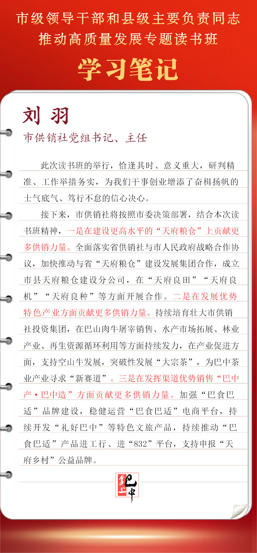 接下來,市供銷社將按照市委決策部署,結(jié)合本次讀書班精神,全面落實(shí)省供銷社與市人民政府戰(zhàn)略合作協(xié)議,加快推動(dòng)與省“天府糧倉”建設(shè)發(fā)展集團(tuán)合作,成立市縣天府糧倉建設(shè)分公司,在“天府良田”“天府良機(jī)”“天府良種”等方面開展合作。持續(xù)培育壯大市供銷社投資集團(tuán),在巴山肉牛屠宰銷售、水產(chǎn)市場拓展、林業(yè)產(chǎn)業(yè)、再生資源循環(huán)利用等方面持續(xù)發(fā)力,在產(chǎn)業(yè)促進(jìn)方面,支持空山牛發(fā)展,突破性發(fā)展“大宗茶”,為巴中茶業(yè)產(chǎn)業(yè)尋求“新賽道”。加強(qiáng)“巴食巴適”品牌建設(shè),穩(wěn)健運(yùn)營“巴食巴適”電商平臺(tái),持續(xù)開發(fā)“禮好巴中”等特色文旅產(chǎn)品,持續(xù)推動(dòng)“巴食巴適”產(chǎn)品進(jìn)工行、進(jìn)“832”平臺(tái),支持申報(bào)“天府鄉(xiāng)村”公益品牌。